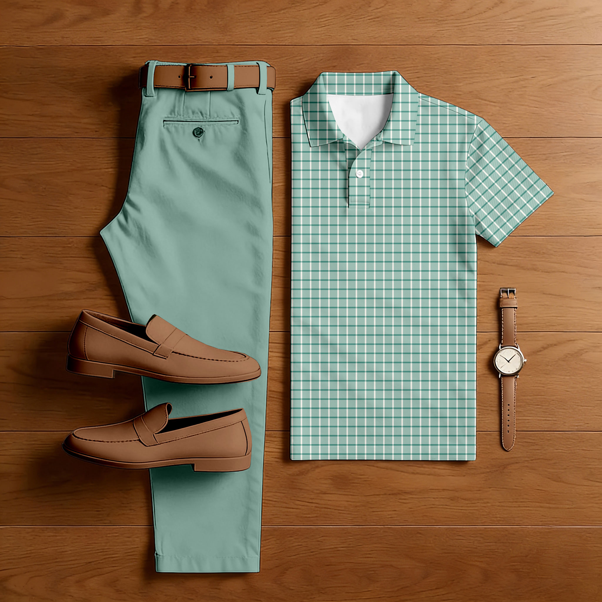 Men's Casual Green & White Color Matching Checkered Printed Short Sleeved Polo Shirt & Trousers Two-Piece Set