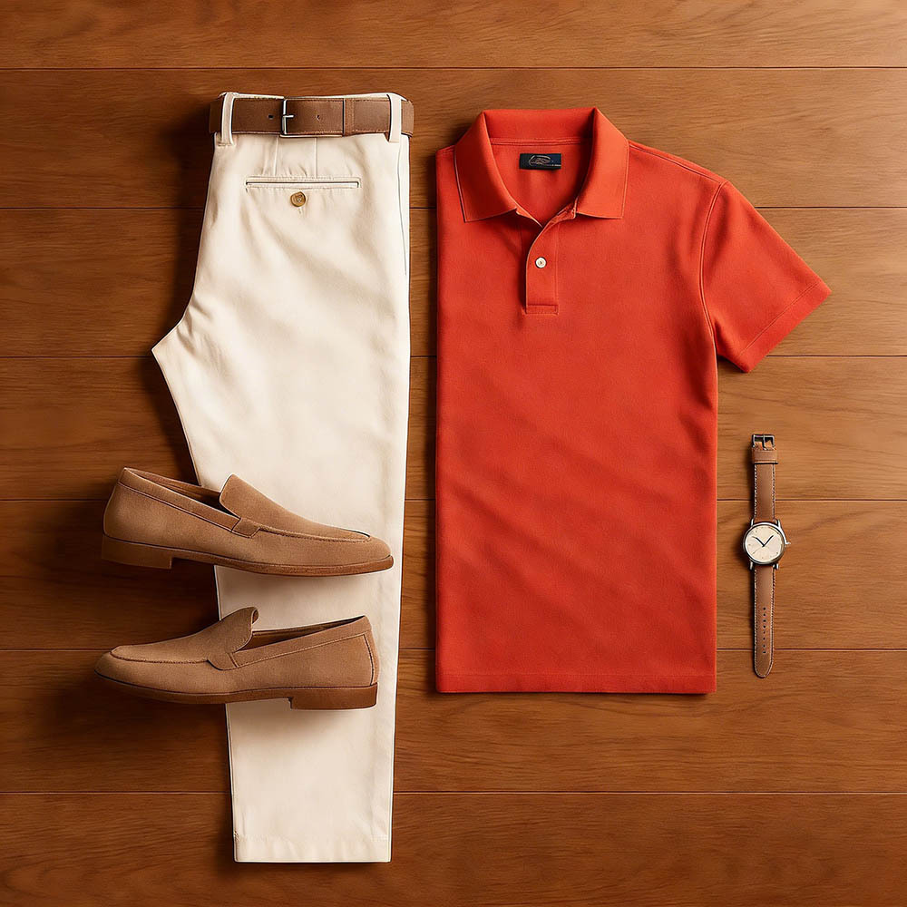 Men's Casual Orange Red & Khaki Color Matching Short Sleeved Polo Shirt & Trousers Two-Piece Set