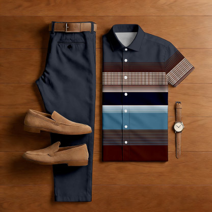 Men's Casual Navy Blue & Multi Color Matching Striped Print Short-Sleeve Shirt & Trousers Two-Piece Set