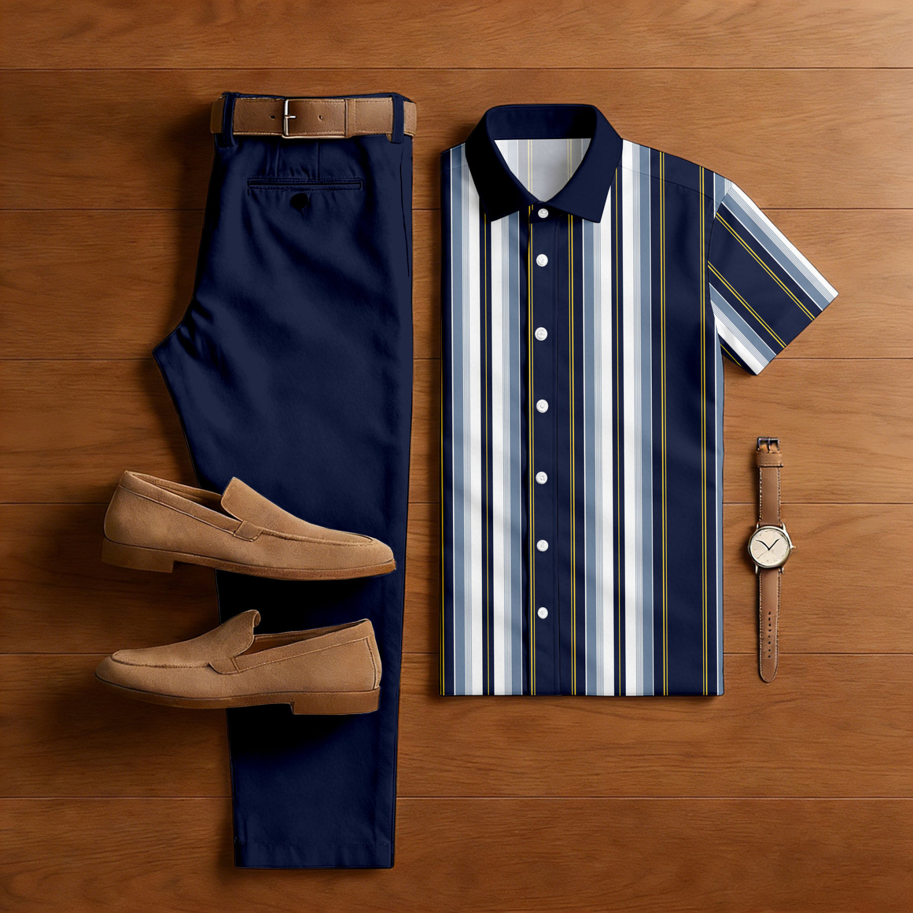 Men's Casual Navy Blue & White Color Matching Striped Print Short-Sleeve Shirt & Trousers Two-Piece Set