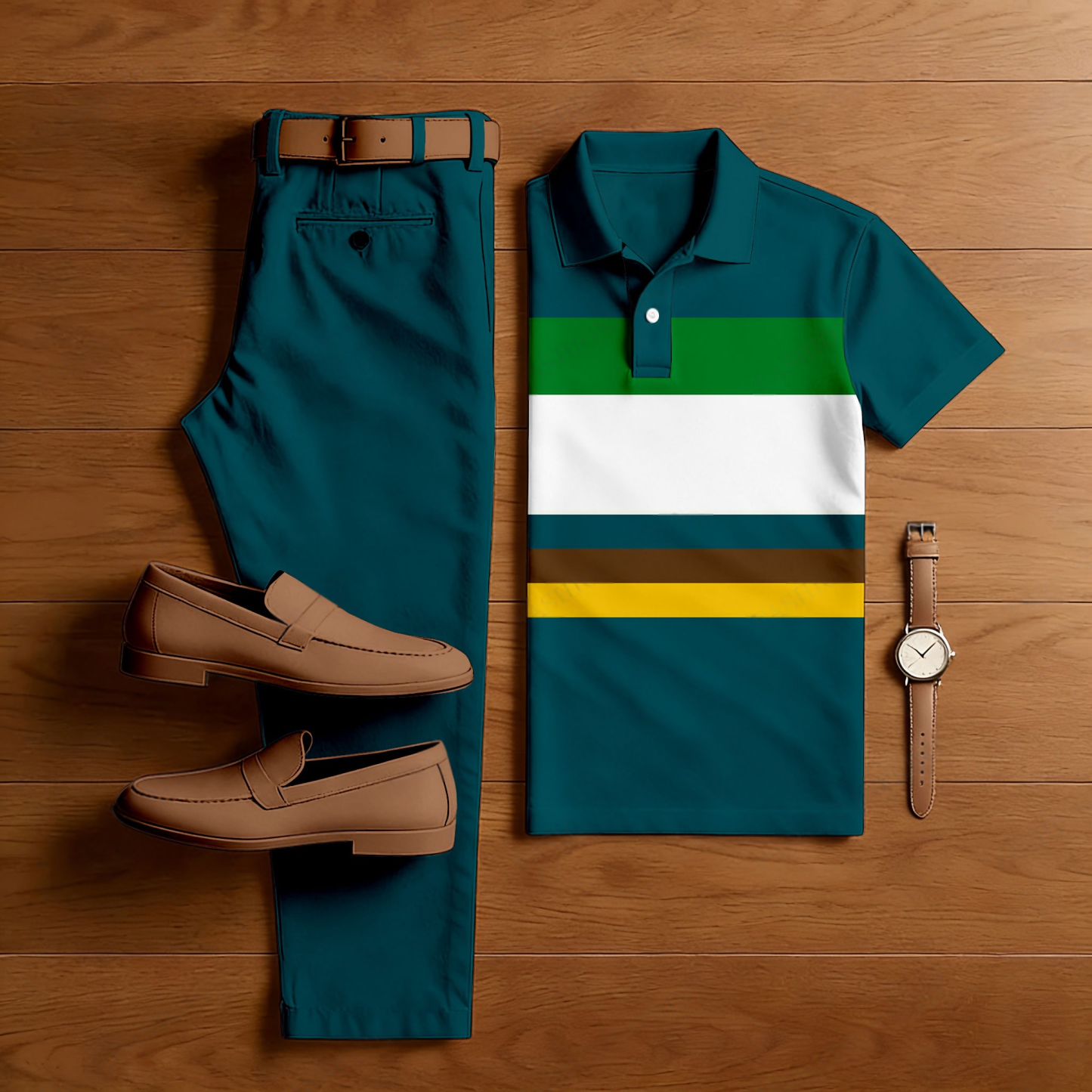 Men's Casual Peacock Green & Multi Color Matching Striped Printed Short Sleeved Polo Shirt & Trousers Two-Piece Set