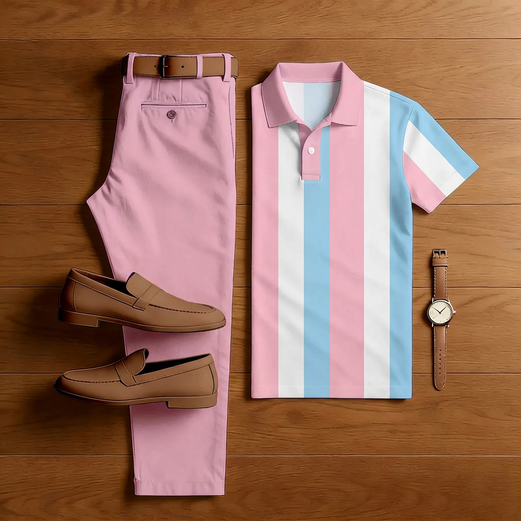 Men's Casual Pink And Blue Striped Print Short-Sleeved Polo Shirt And Trousers Two-Piece Set