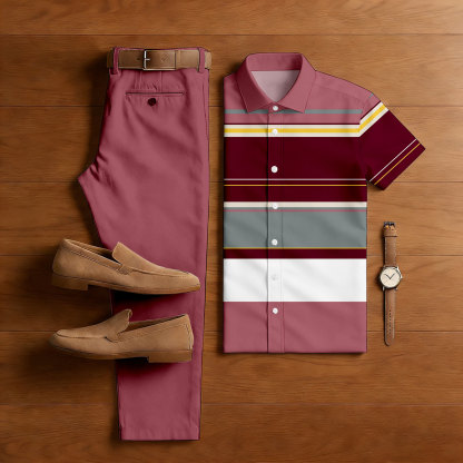 Men's Casual Pink & Maroon Color Matching Striped Print Short-Sleeve Shirt & Trousers Two-Piece Set