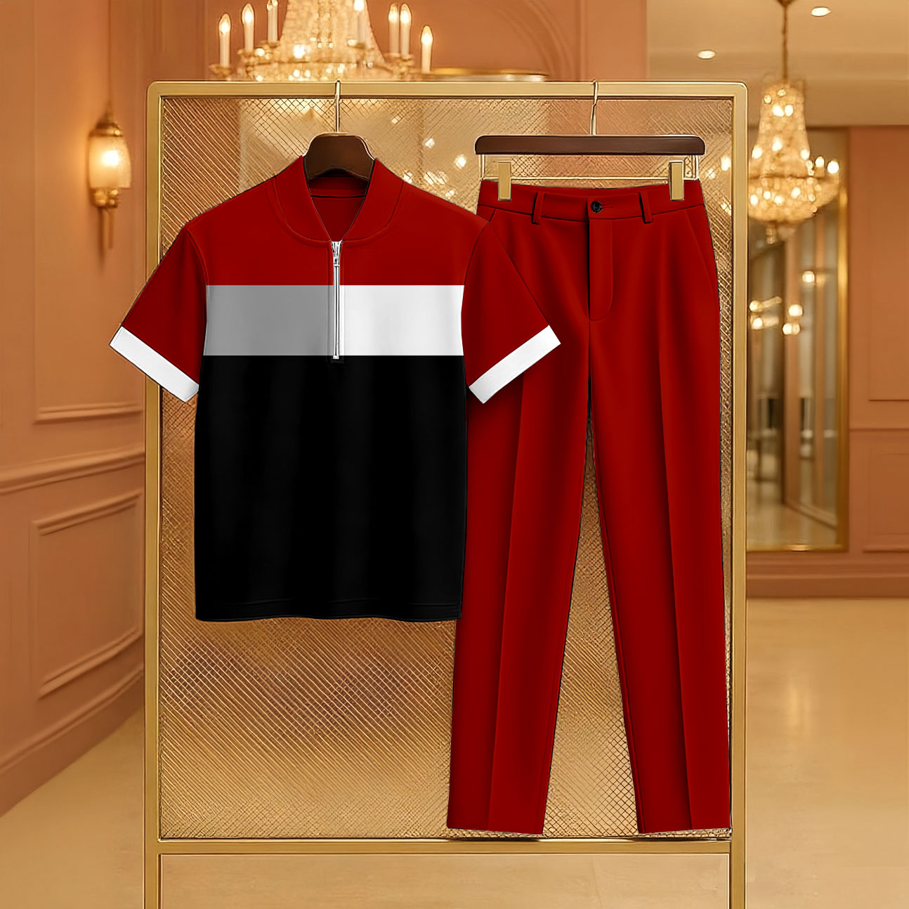 Men's Casual Red & Black Color Matching Geometric Printed Zipper Short Sleeved Polo Shirt & Trousers Two-Piece Set
