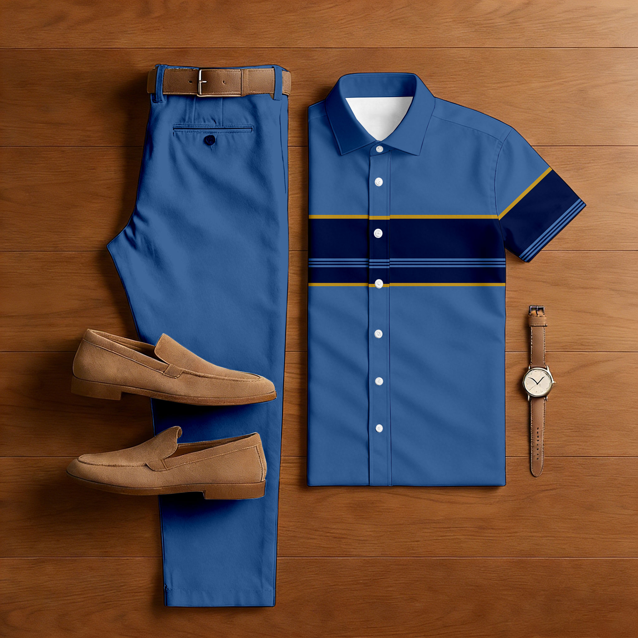 Men's Casual Royal Blue Color Matching Striped Print Short-Sleeve Shirt & Trousers Two-Piece Set