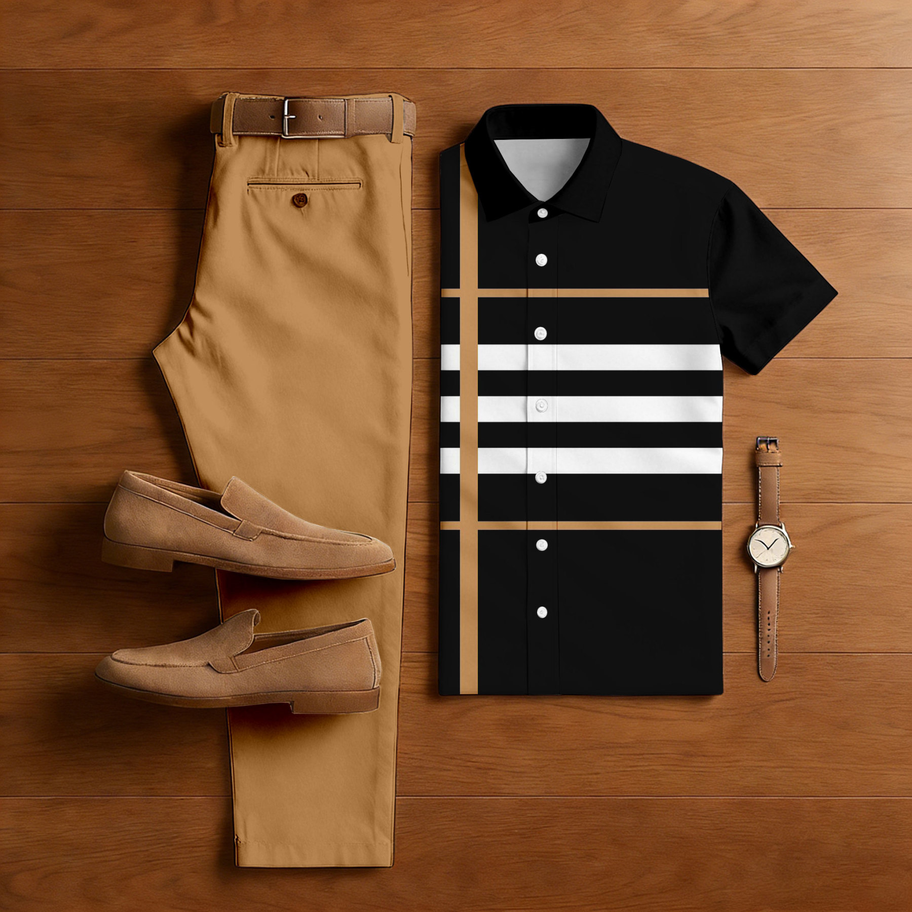 Men's Casual Tan & Black Color Matching Striped Print Short-Sleeve Shirt & Trousers Two-Piece Set