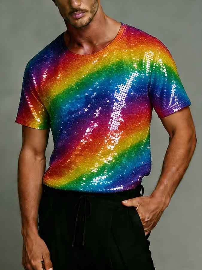 Men's Crew Neck Slim-Fit Pride Month Rainbow Print T-Shirt