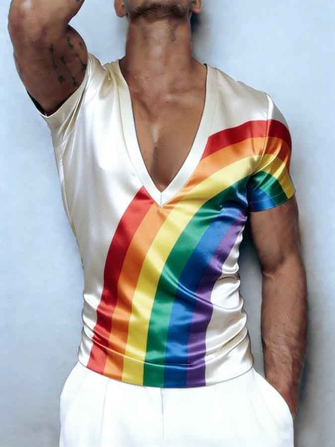 Men's Deep V-Neck Slim-Fit T-Shirt with Pride Month Rainbow Print (Short Sleeve)