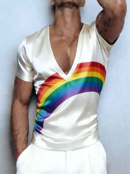 Men's Deep V-Neck Slim-Fit T-Shirt with Pride Month Rainbow Print (Short Sleeve)