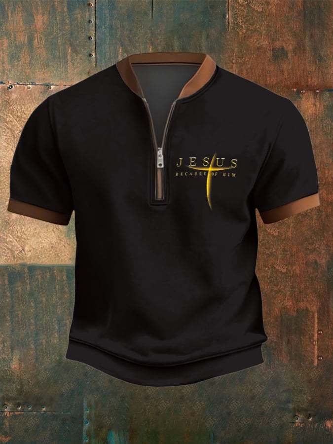 Men's Faith “Jesus Because Of Him” Print Zip-Neck Top