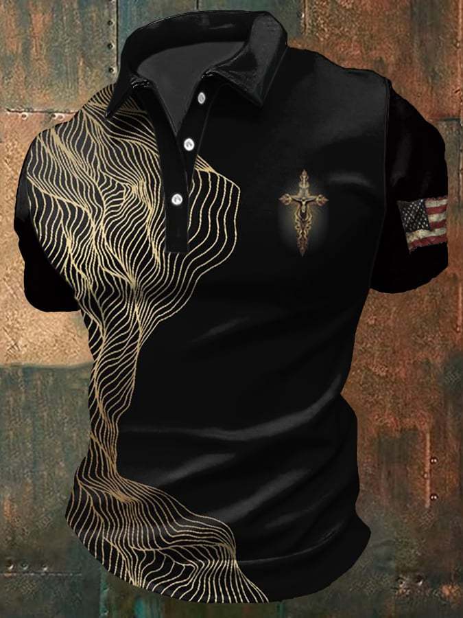 Men's Independence Day American Flag Cross Printed Knitted Pullover Polo Shirt Tops