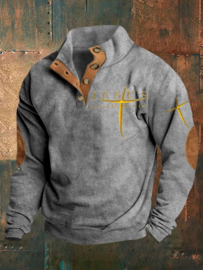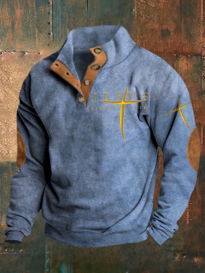 Men's Jesus Because Of Him Printed Stand Collar Button-Up Sweatshirt