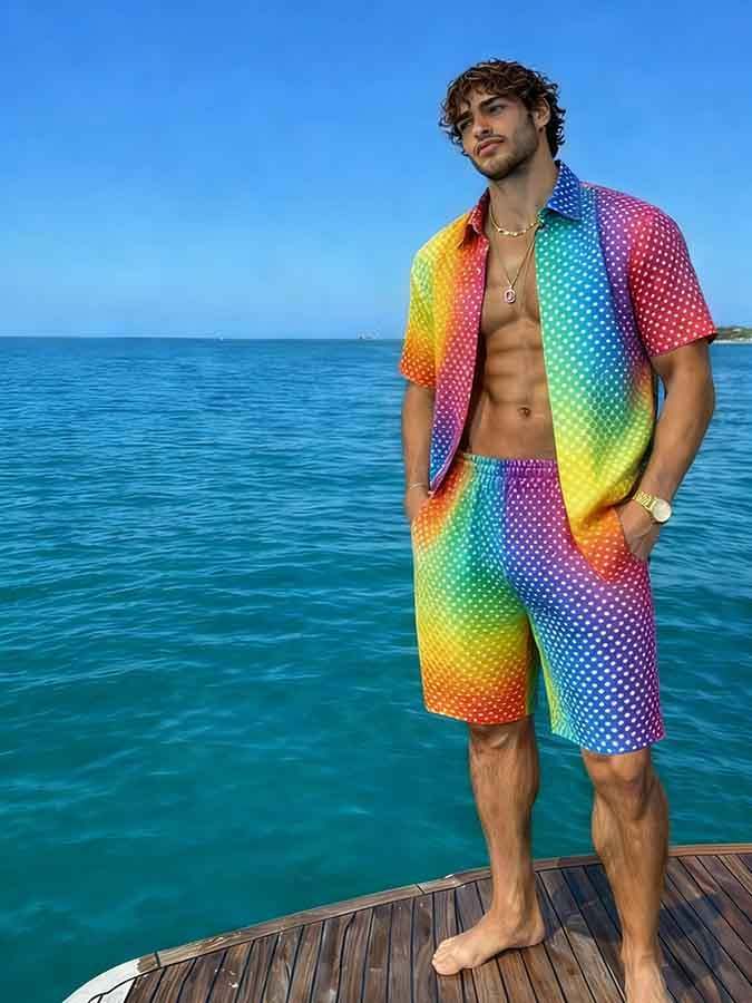 Men's Lapel Short-Sleeve Shirt and Shorts Set with Pride Month Rainbow Print
