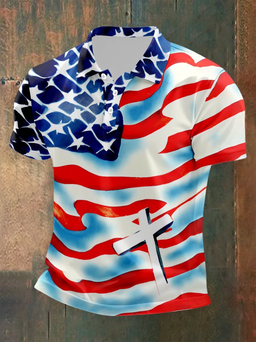 Men's Outdoor Independence Day American Flag Button Short Sleeve Polo Shirt