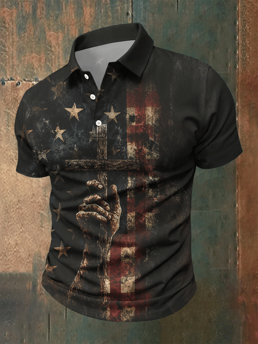 Men's Outdoor Independence Day American Flag Button Short Sleeve Polo Shirt