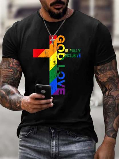 Men's Rainbow Pride Month Faith Cross GOD LOVE Printed Round Neck Casual T-Shirt
