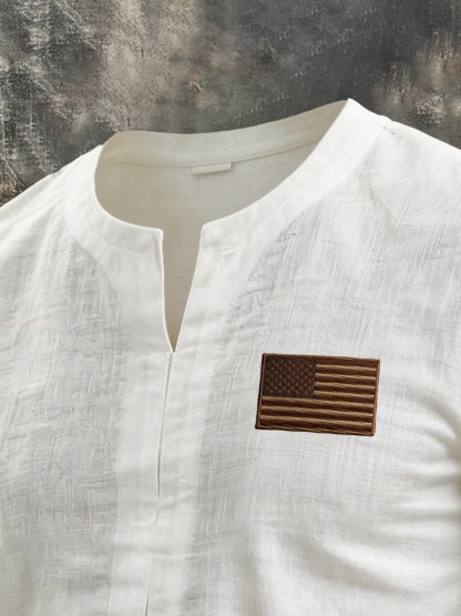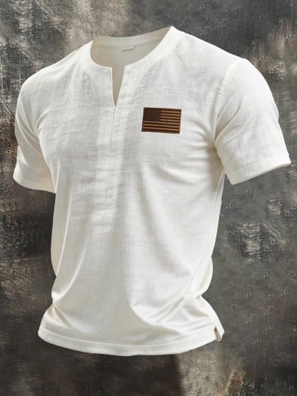 Men's Retro Cotton-Linen "Patriot" Short-Sleeve T-Shirt with Small V-Neck
