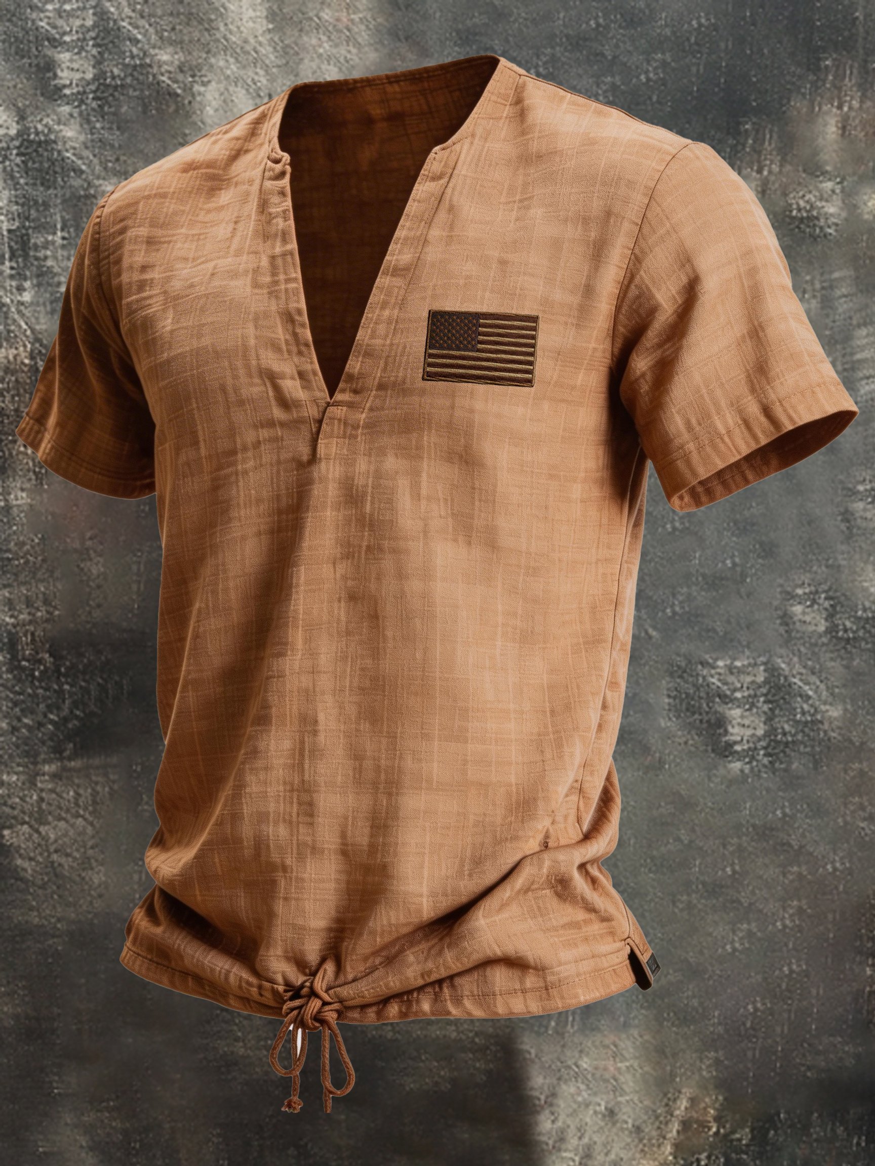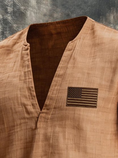 Men's Retro Cotton-Linen Patriotic V-Neck Short-Sleeve T-Shirt with Drawstring Detail