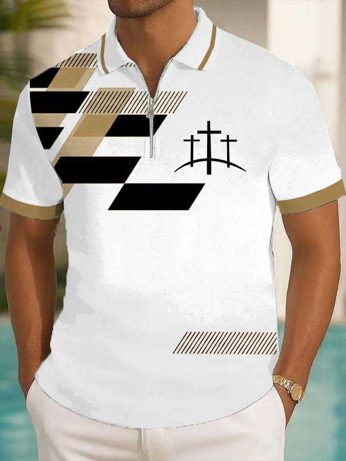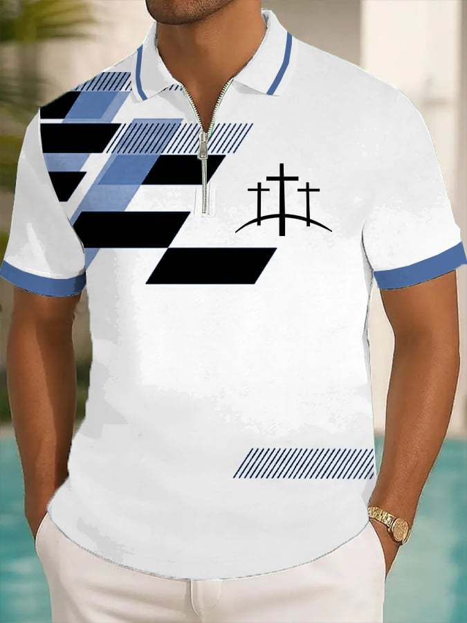 Men's Retro Faith Cross Design Printed Casual Zipper Polo Shirt