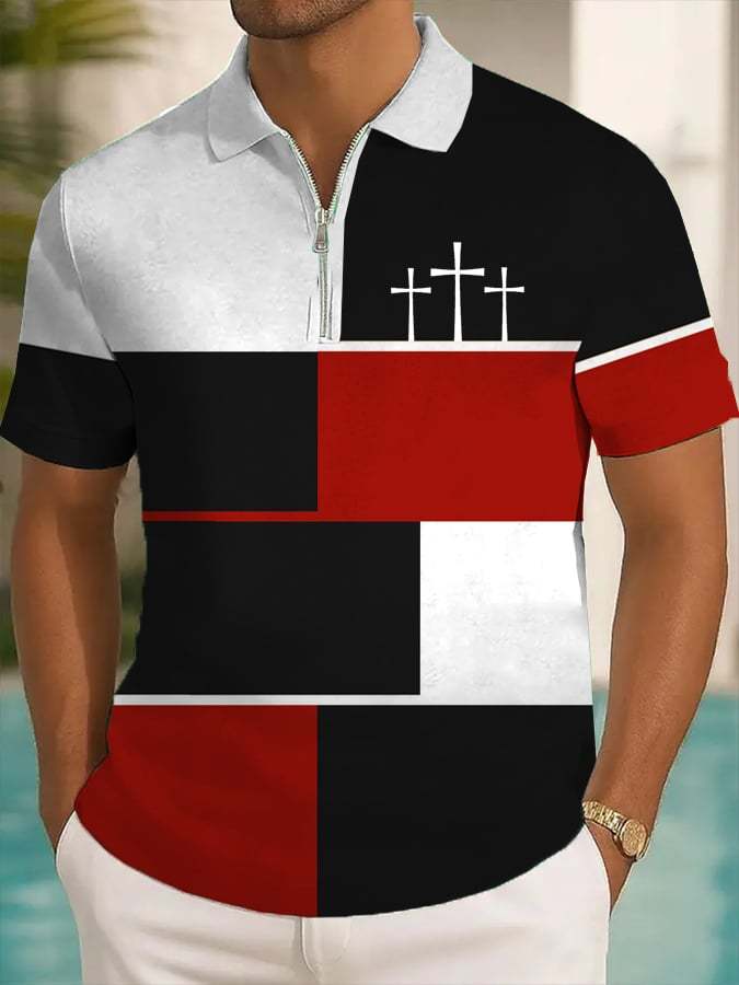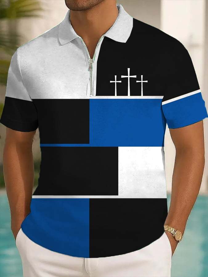 Men's Retro Faith Cross Design Printed Casual Zipper Polo Shirt