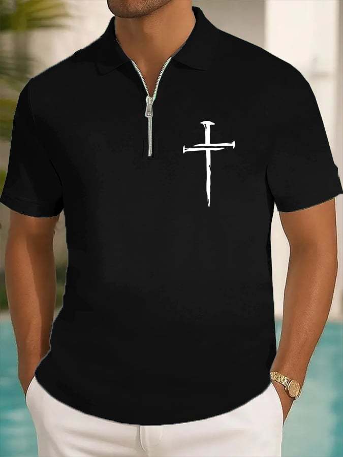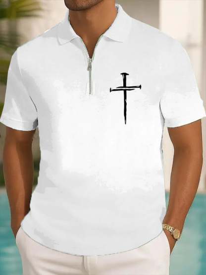 Men's Retro Faith Cross Design Printed Casual Zipper Polo Shirt