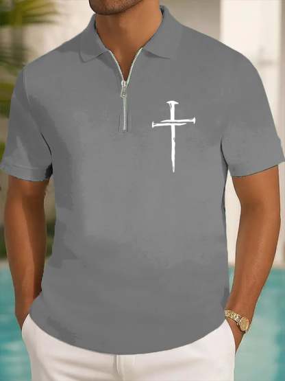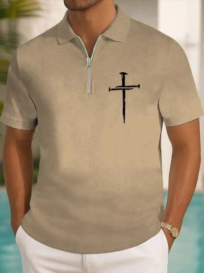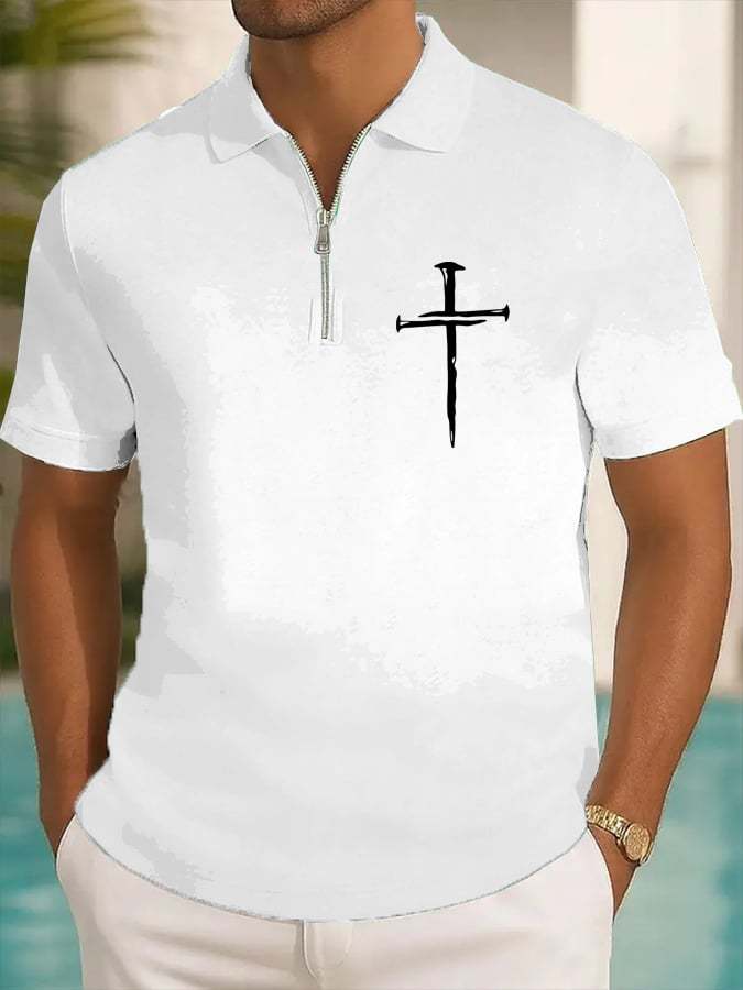 Men's Retro Faith Cross Design Printed Casual Zipper Polo Shirt – lolonb