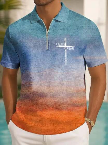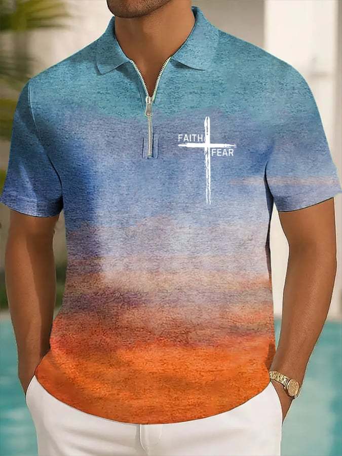 Men's Retro Faith Over Fear Design Printed Casual Zipper Polo Shirt