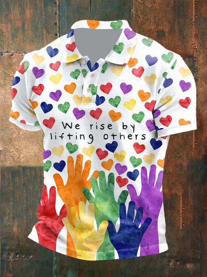 Men's Retro LGBT We Rise By Lifting Others Heart Rainbow Print Polo Shirt