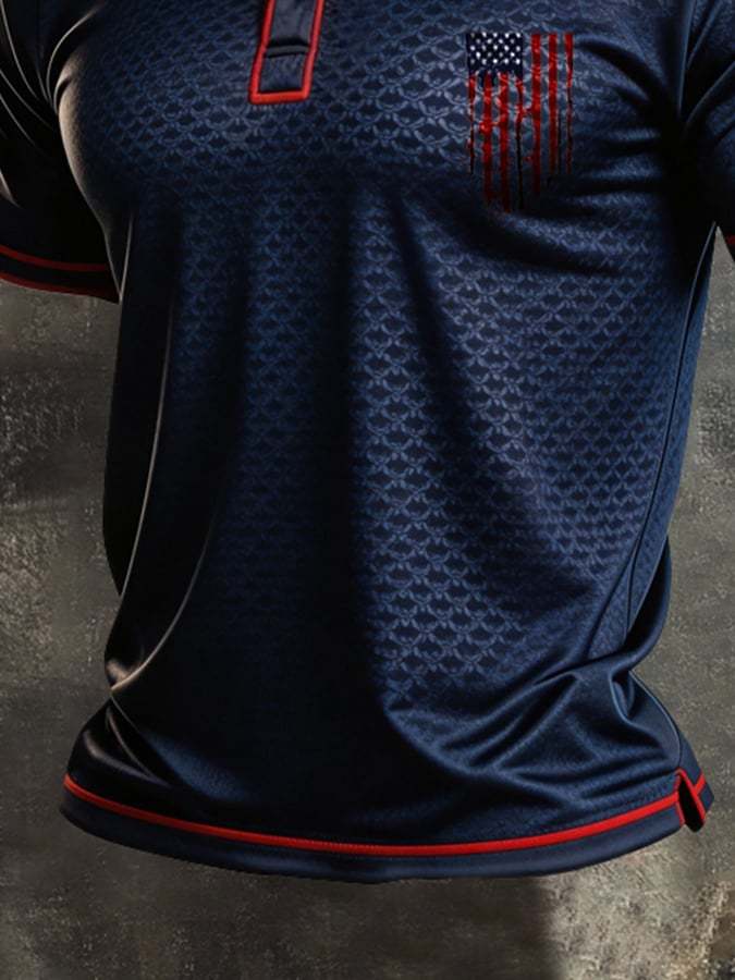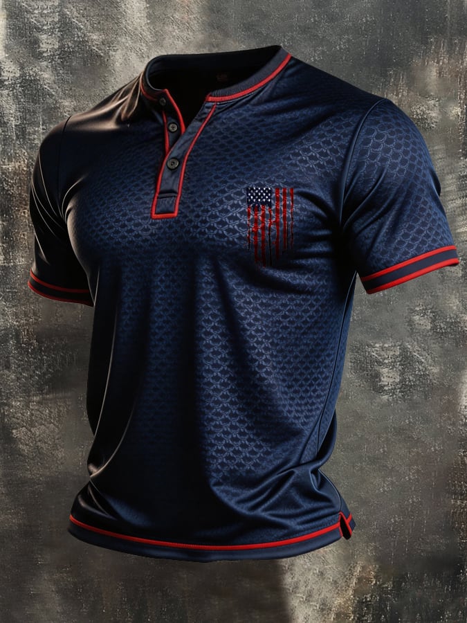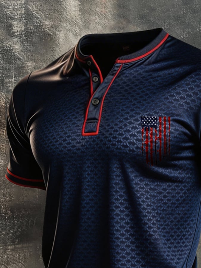 Men's Retro Patriotic Color-Block Short-Sleeve Henley T-Shirt