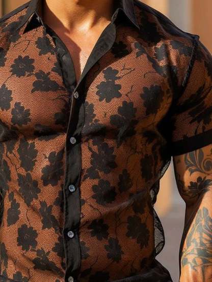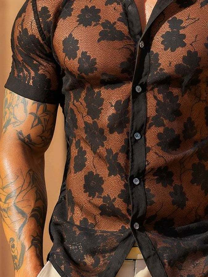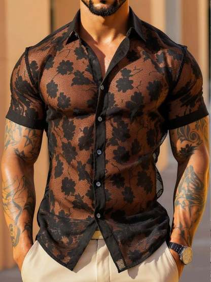 Men's Sexy Lace-Paneled Long-Sleeved Collared Shirt