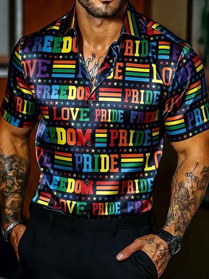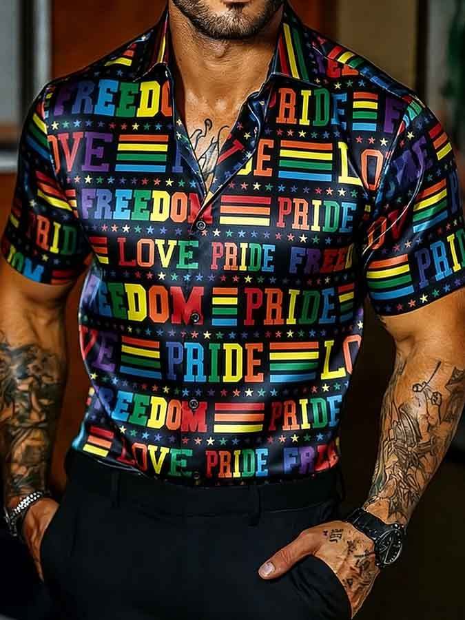 Men's Short-Sleeve Collared Pride Month Rainbow Print Shirt