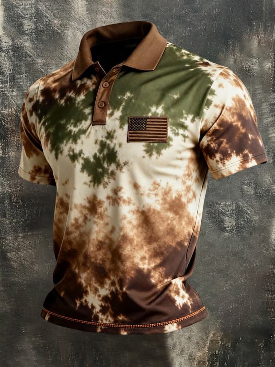 Men's Tie Dye Camo American Flag Print Polo Shirt