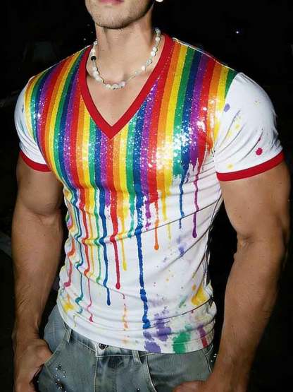 Men's V-Neck Slim-Fit Pride Month Rainbow Print T-Shirt