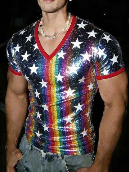 Men's V-Neck Slim-Fit Pride Month Rainbow Print T-Shirt