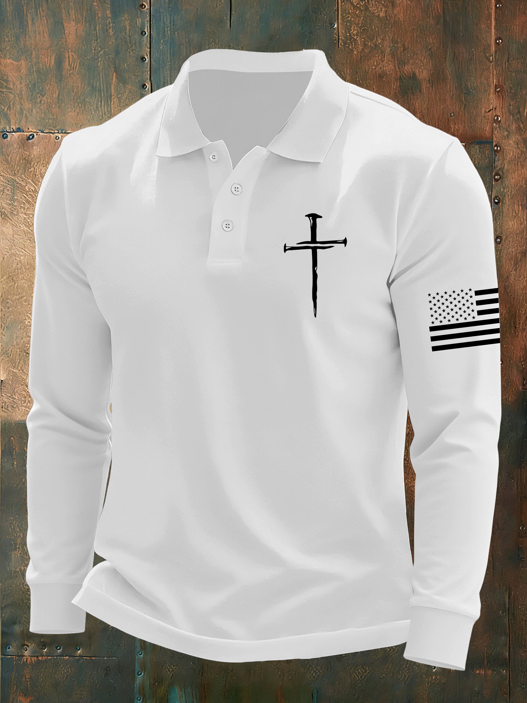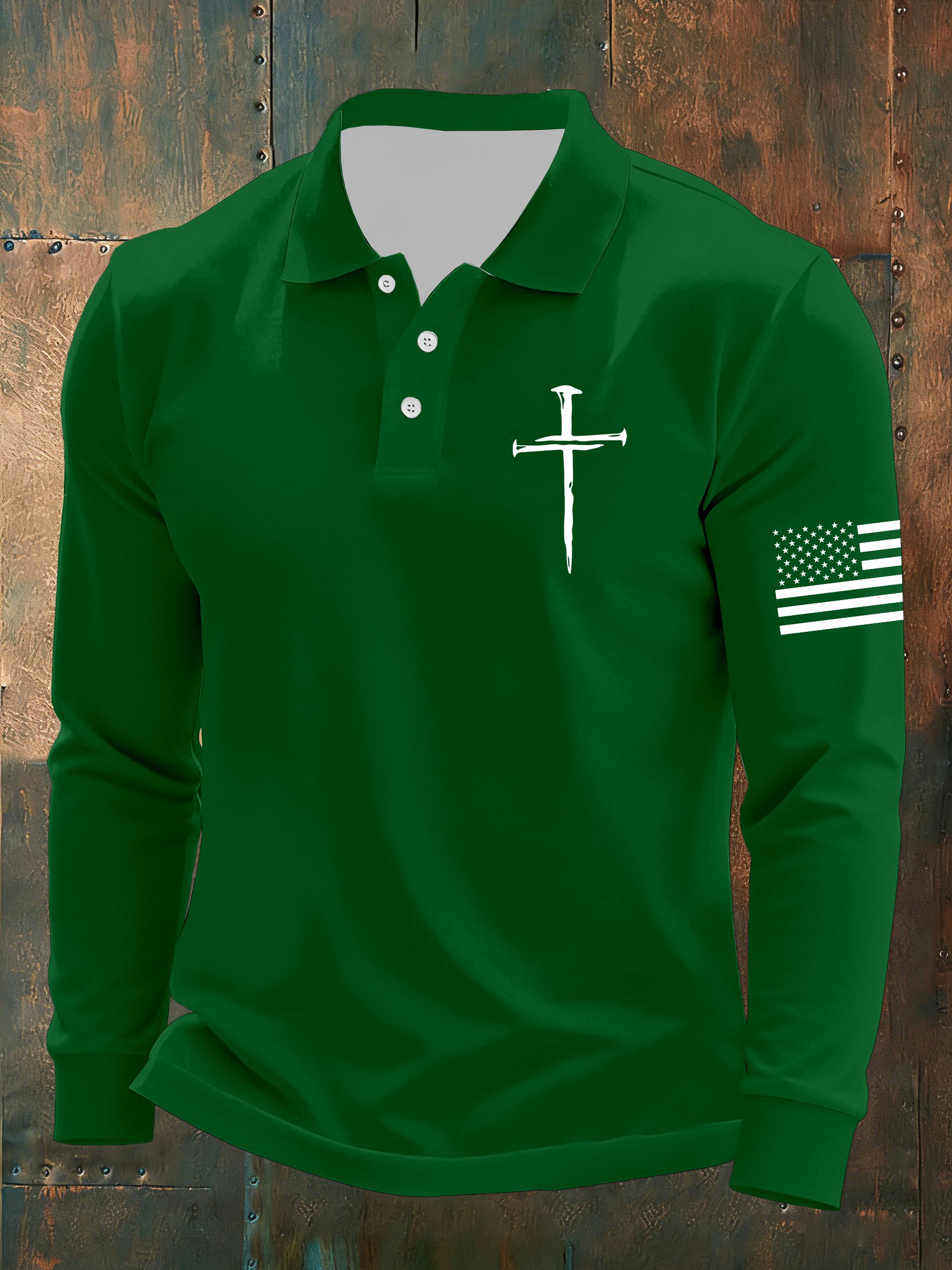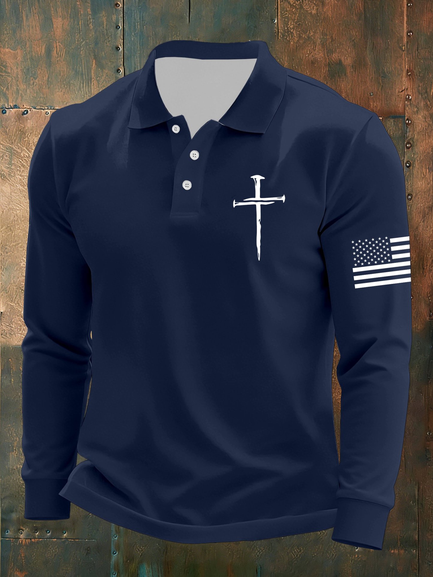 Men's Vintage Flag Faith Cross Printed Casual Long-Sleeved Polo Shirt