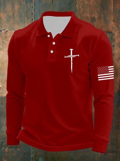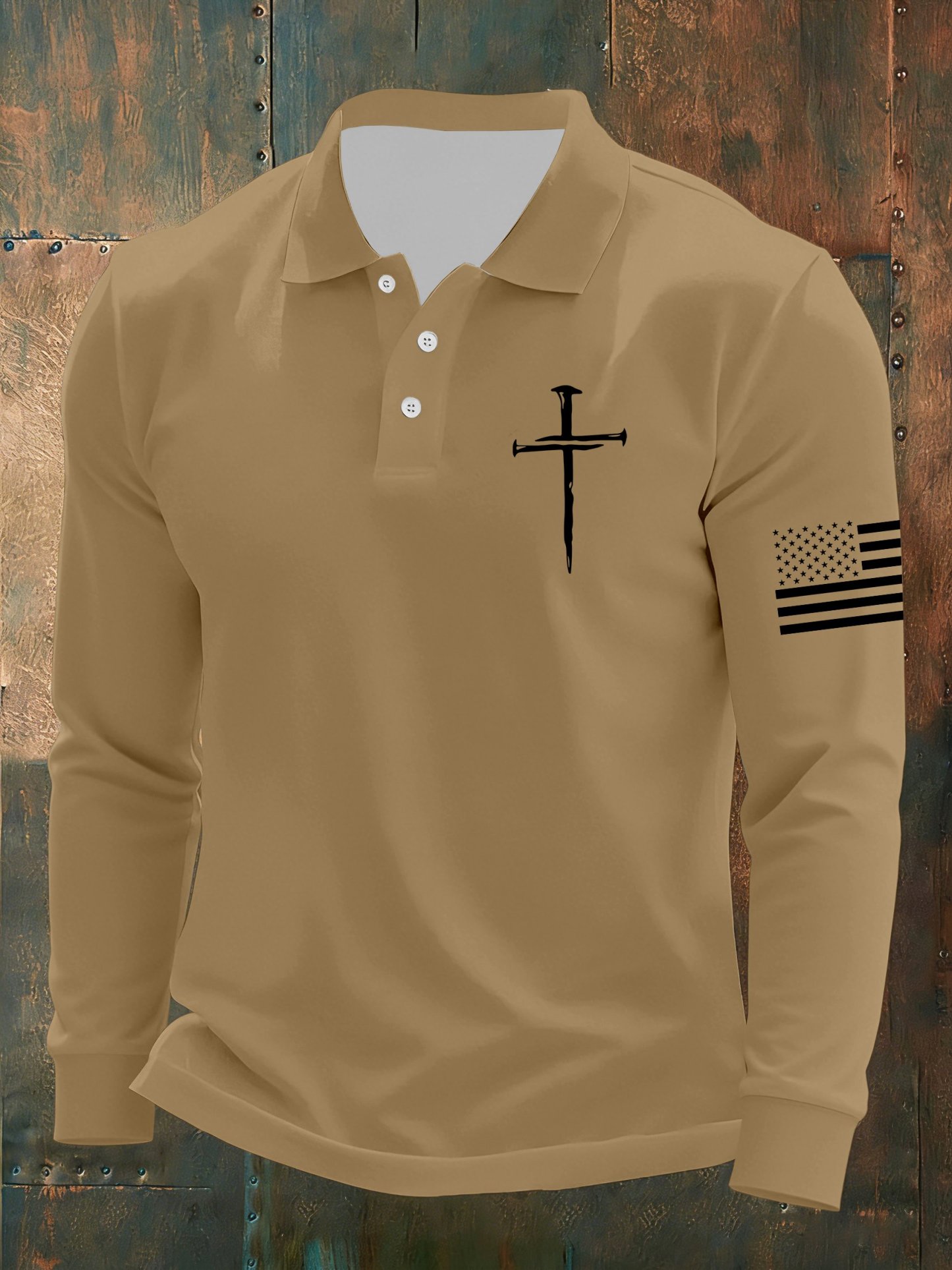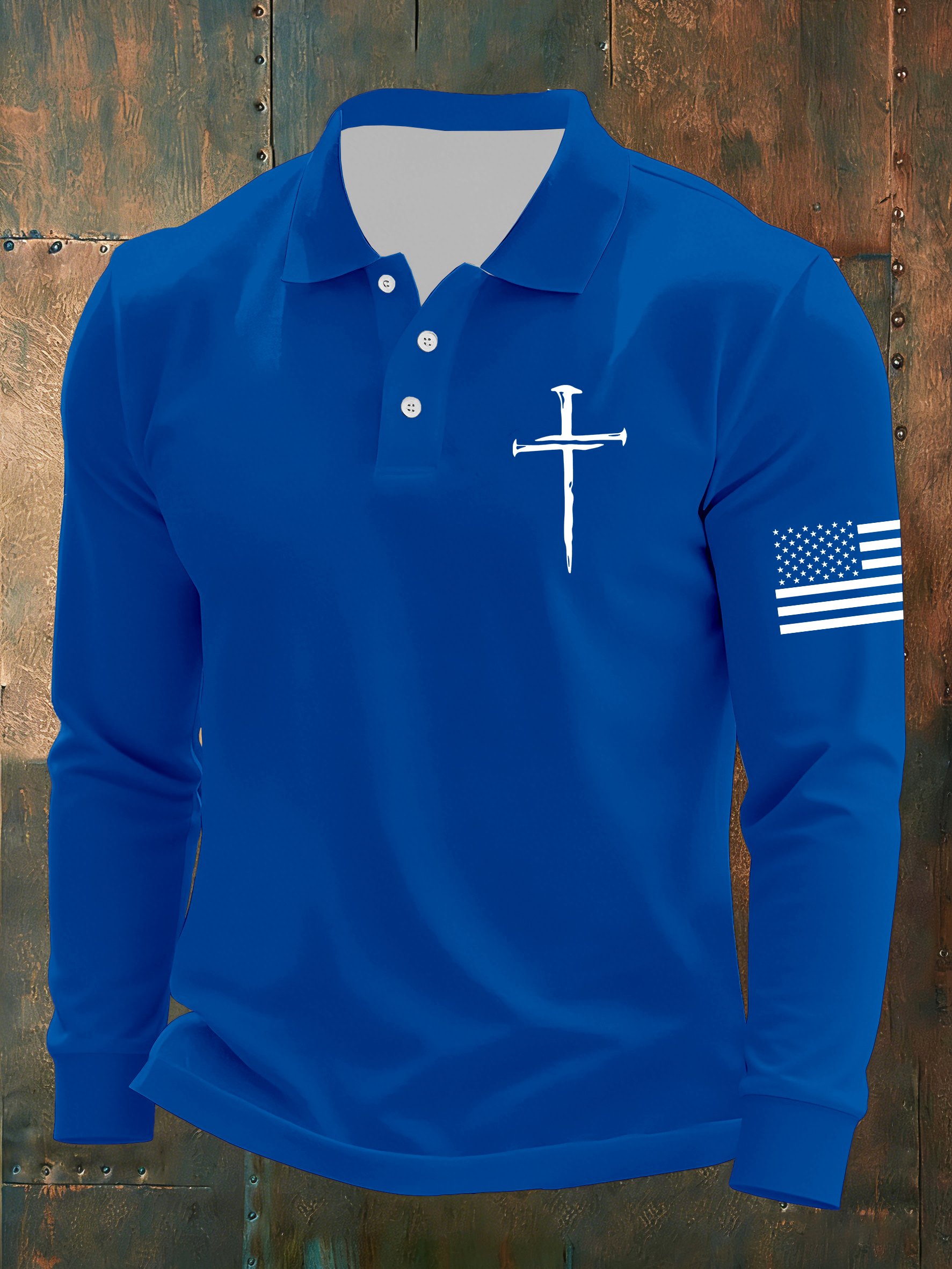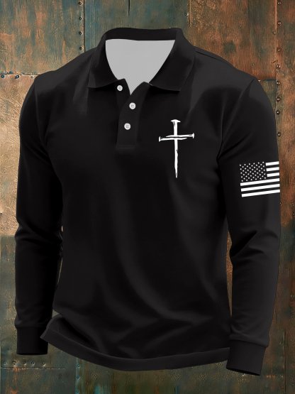 Men's Vintage Flag Faith Cross Printed Casual Long-Sleeved Polo Shirt