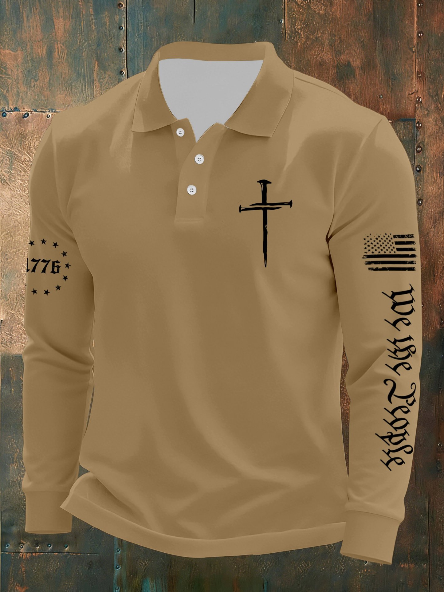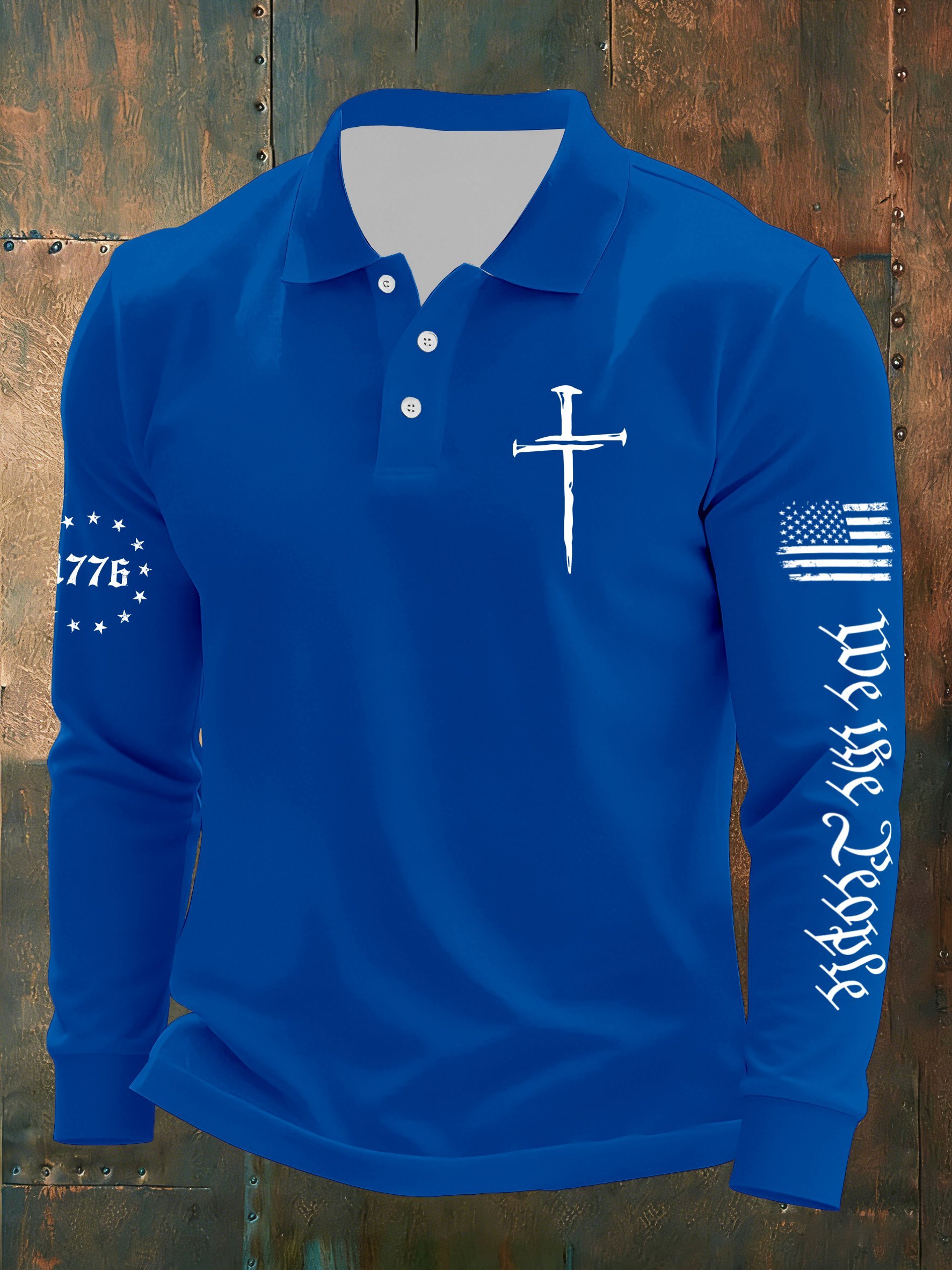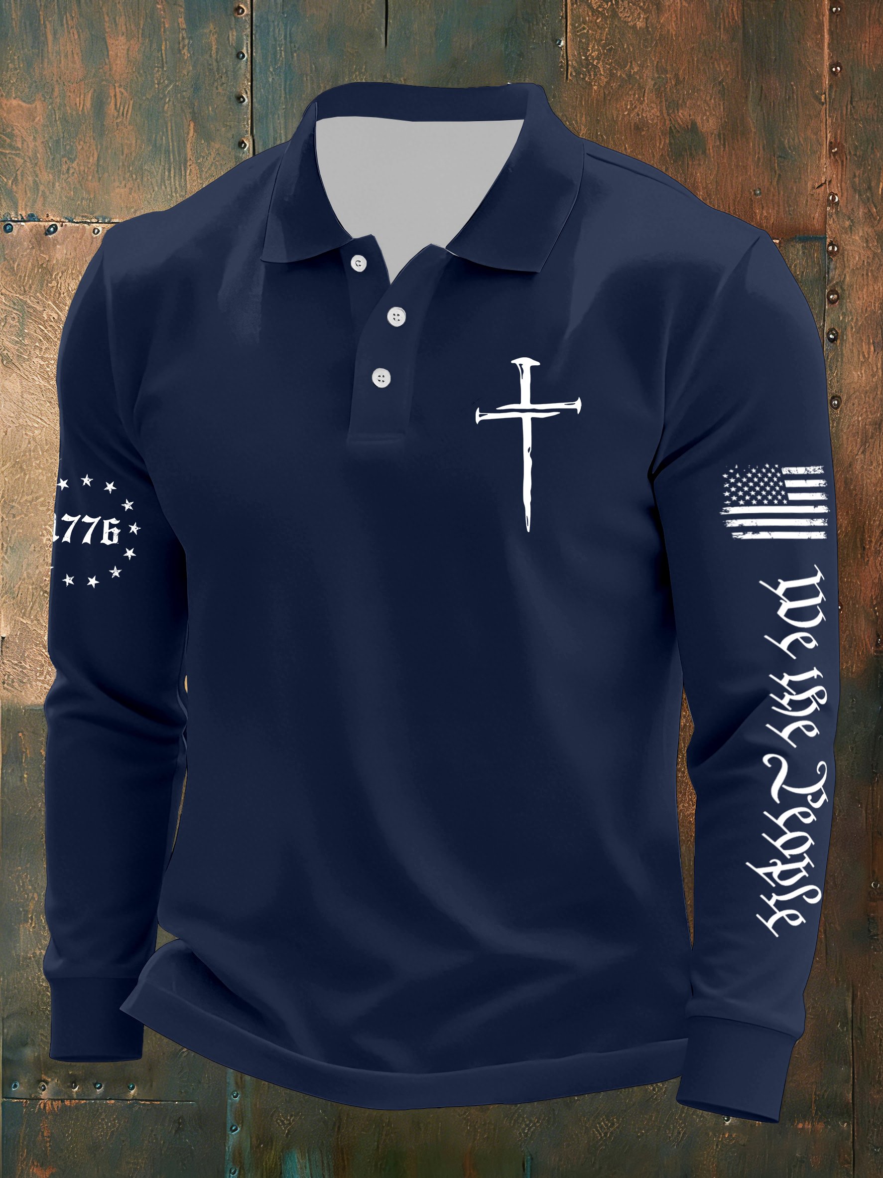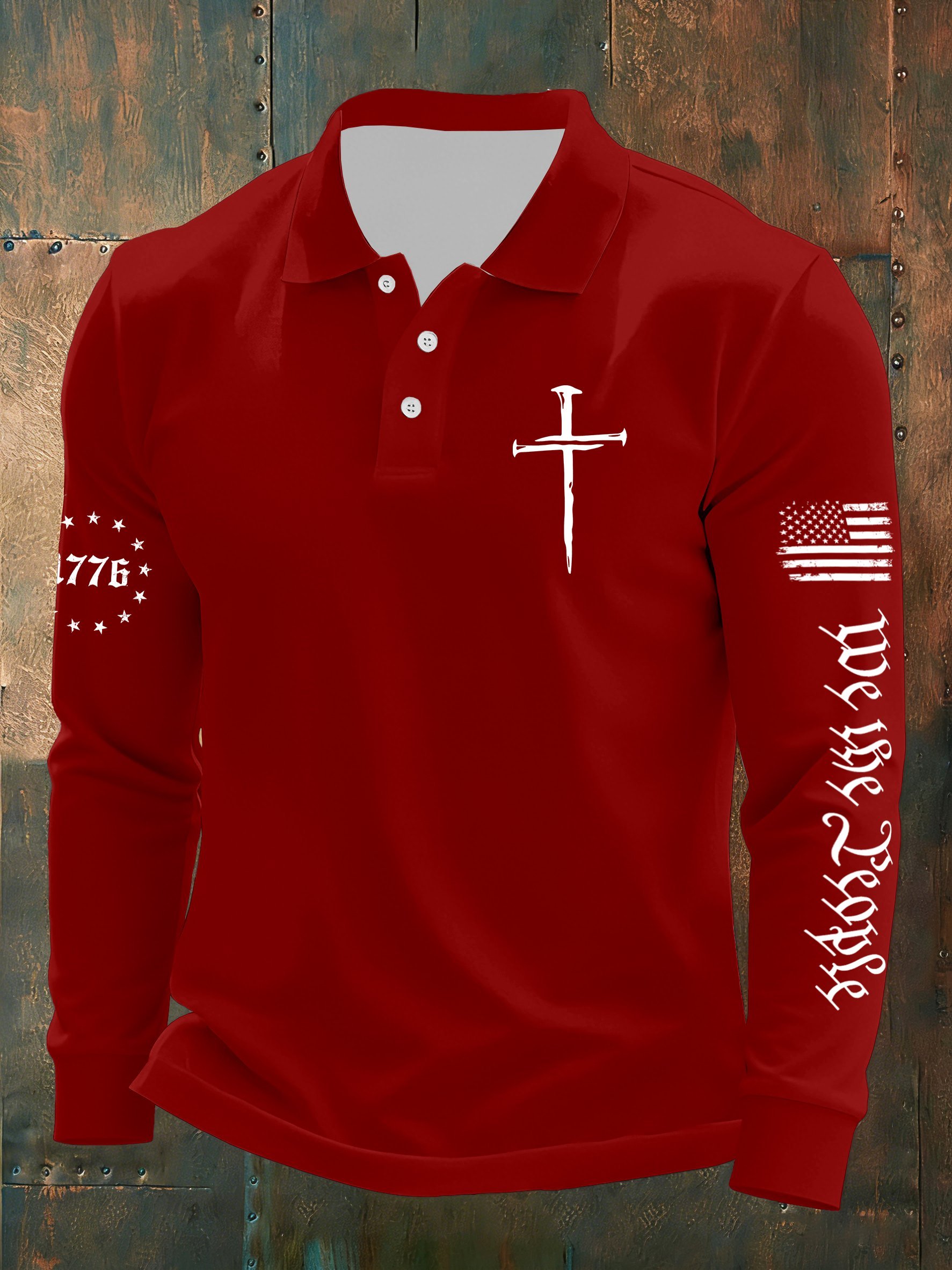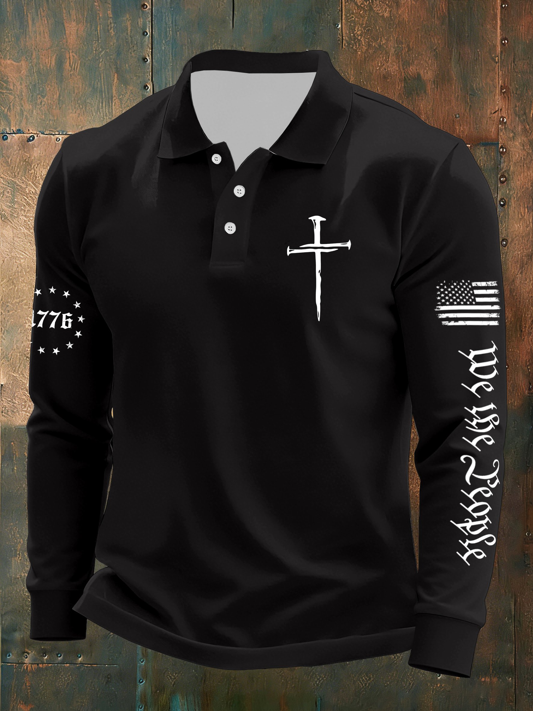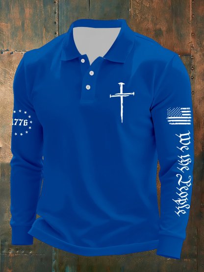 Men's Vintage Flag Faith Cross Printed Casual Long-Sleeved Polo Shirt