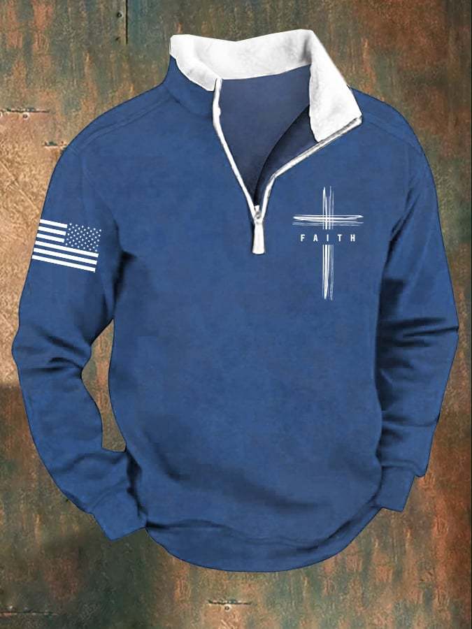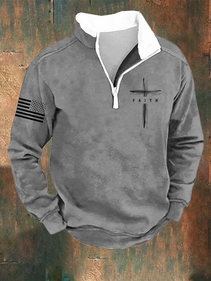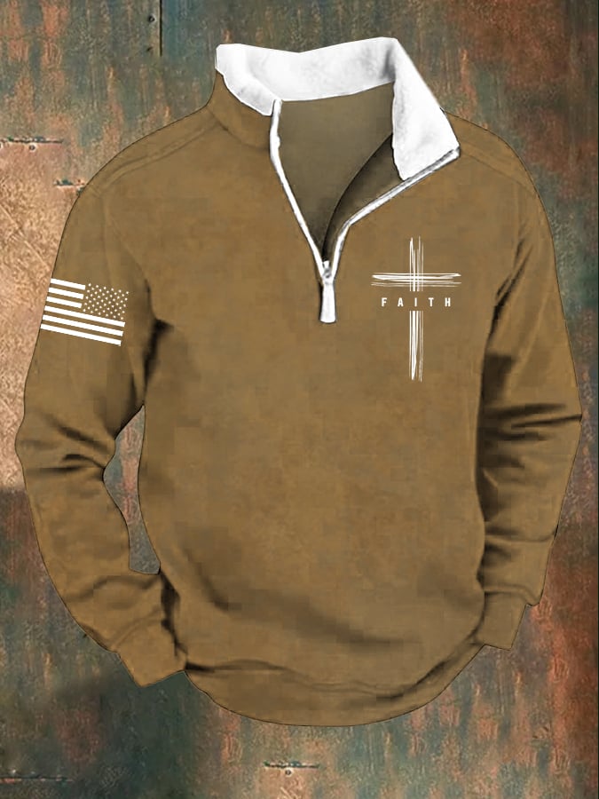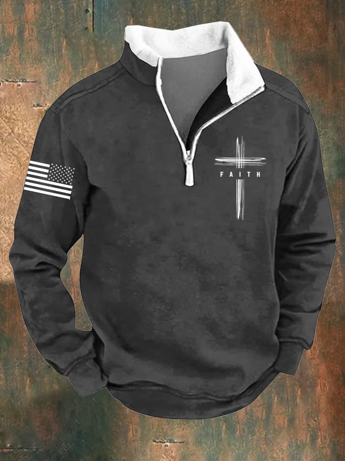 Men's Vintage Flag Faith Zipper Fur Collar Sweatshirt