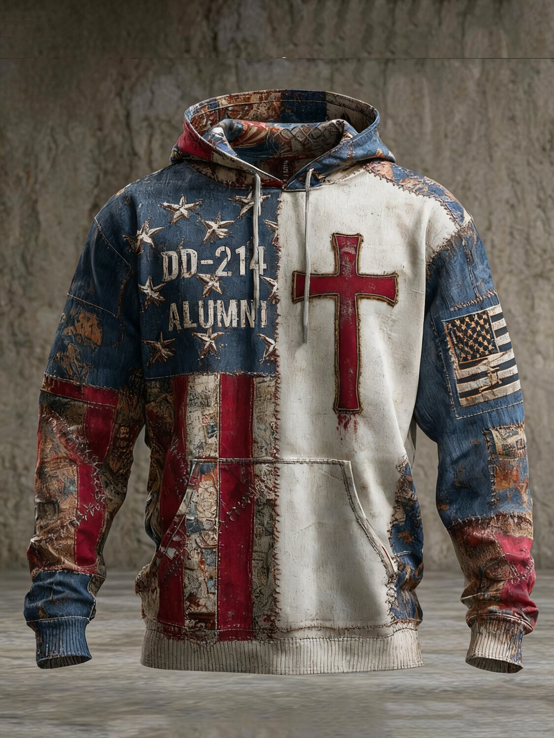 Men's Vintage Patchwork American Flag Cross Art Print Pocket Hoodie