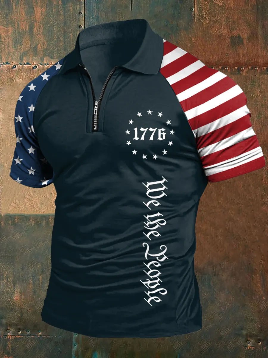 Men's We The People 1776 Independence Day American Flag Print Zip-Up Raglan Sleeve Polo Shirt