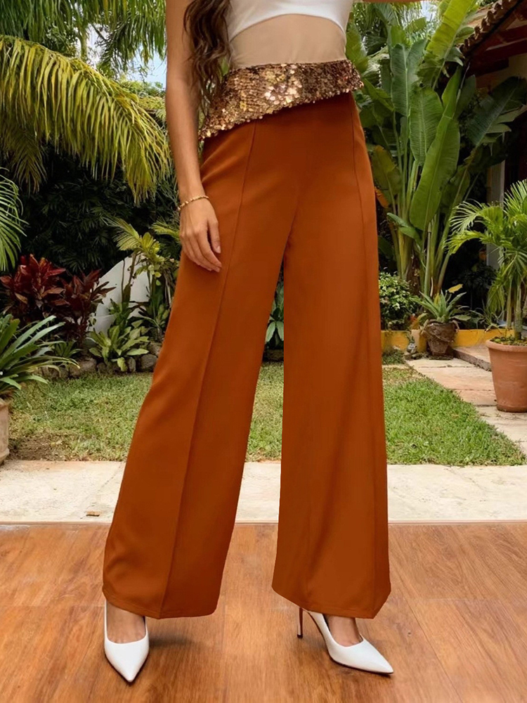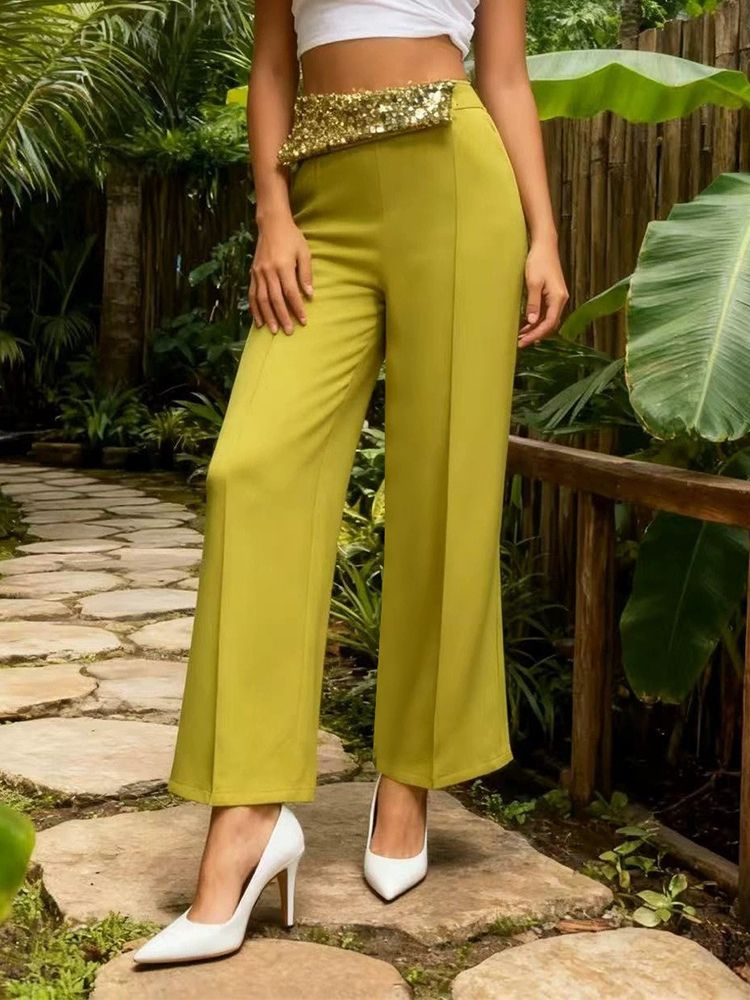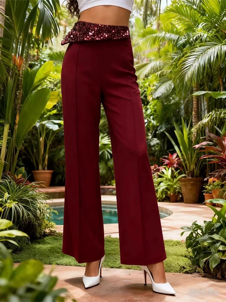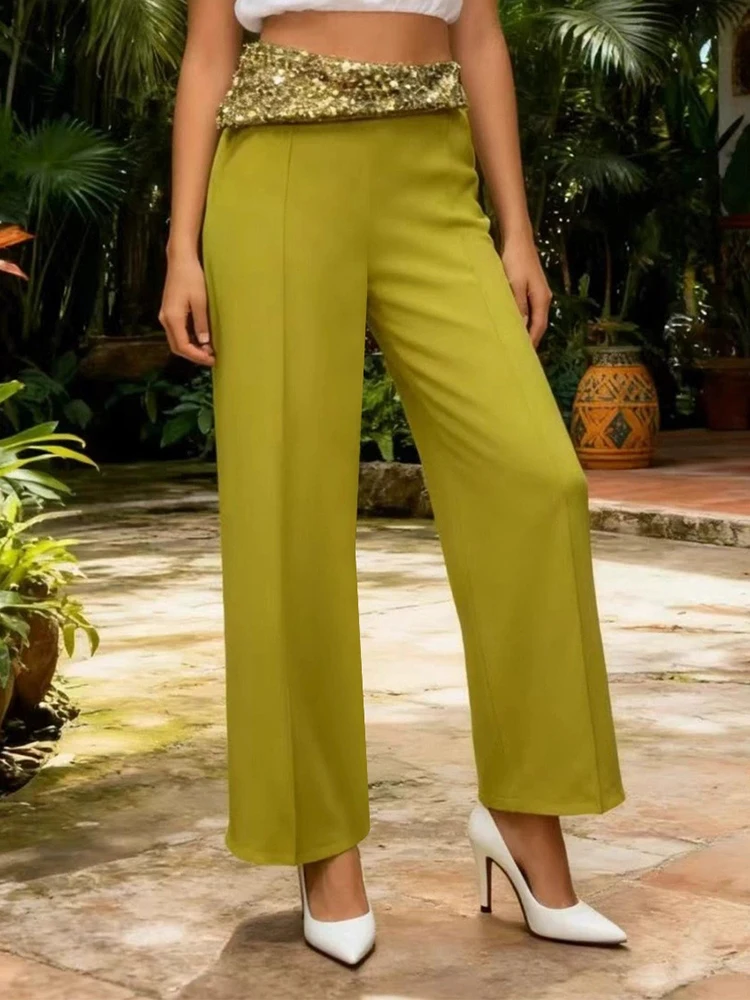 New Women Casual Simple Party Long Trousers Fashion Sequins Spliced High Waist Pants Elegant Solid Color Pocket Straight Pants