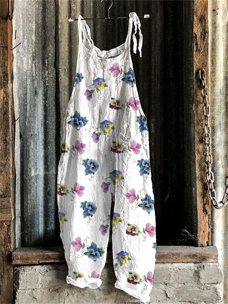 Pansy Flower Embroidery Pattern Linen Blend Casual Jumpsuit