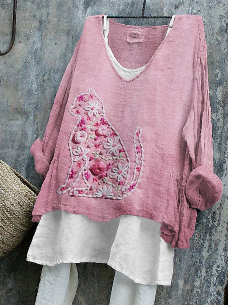 Pink Floral Cat Silhouette Embroidered Linen Tunic