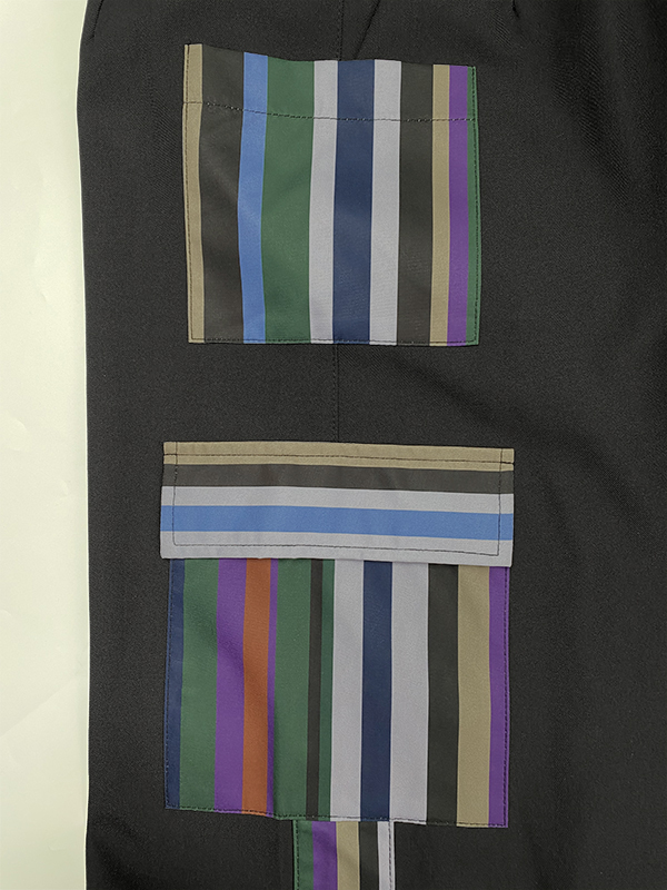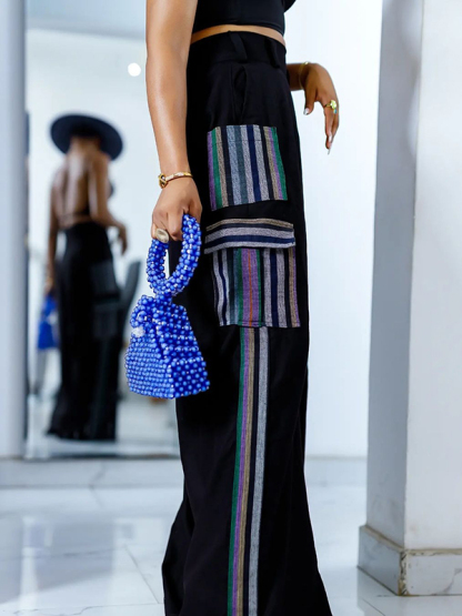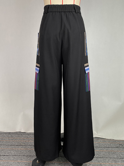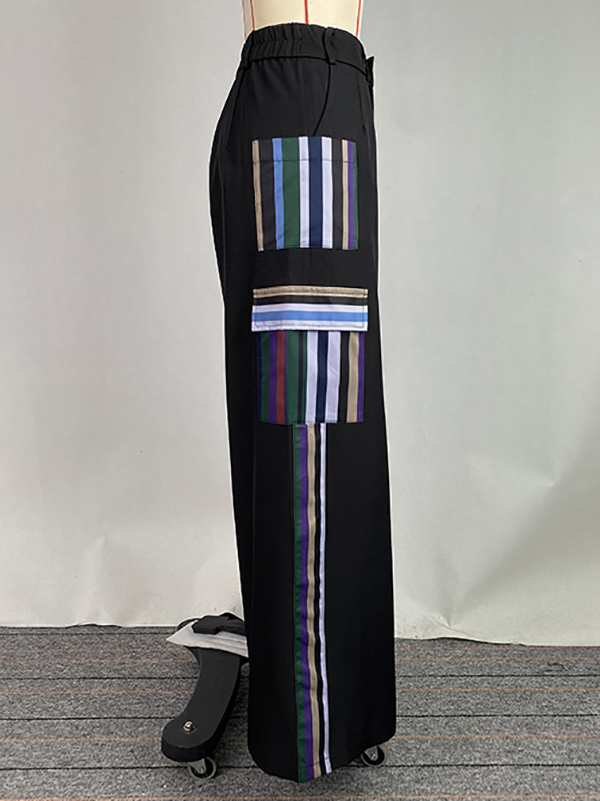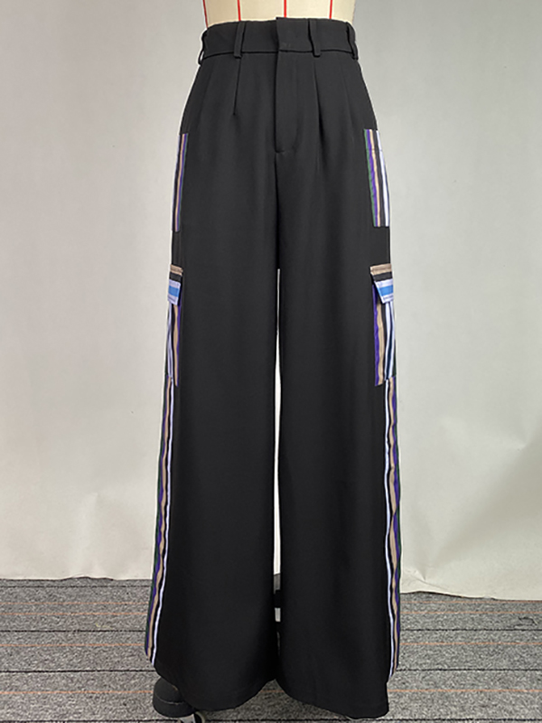 Pockets Split-Joint Striped High Waisted Loose Trousers Pants