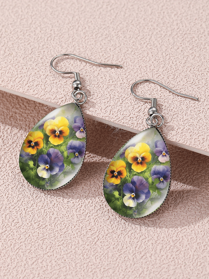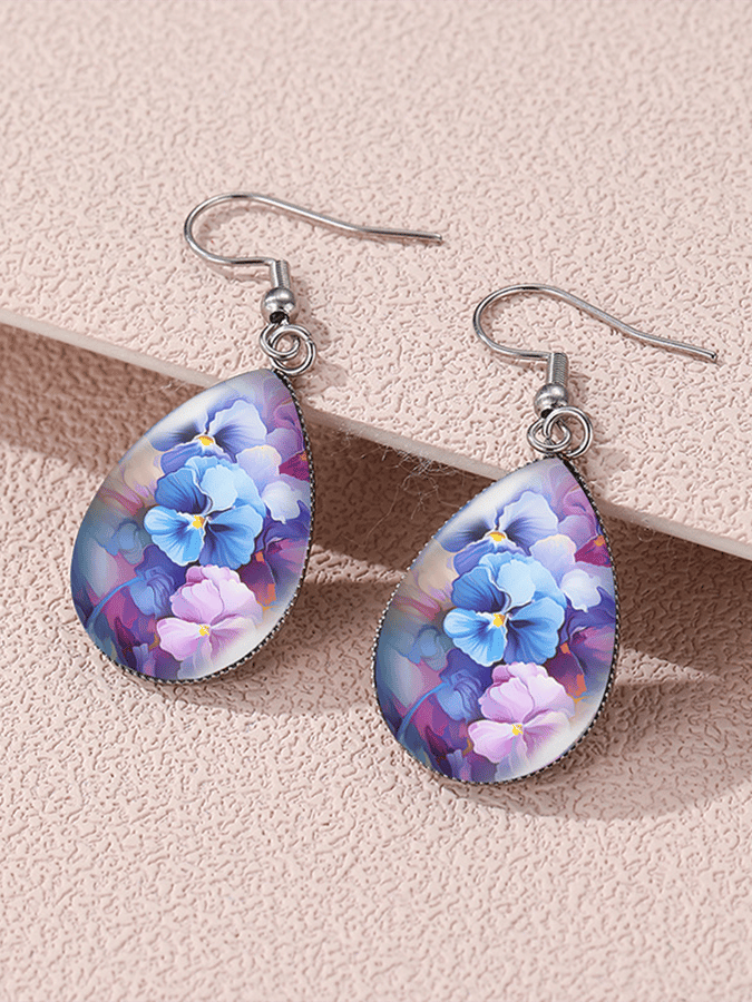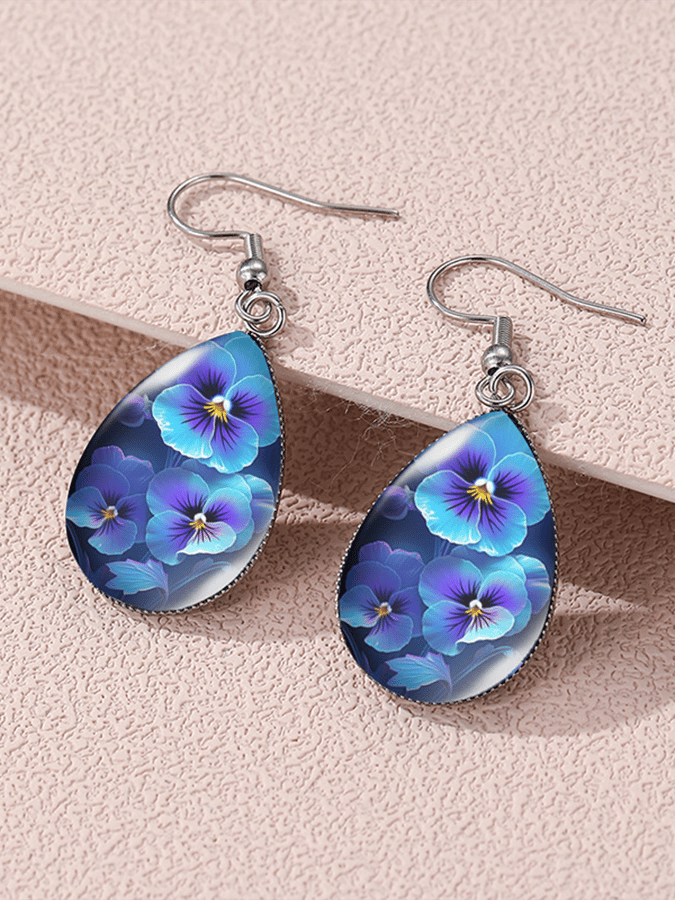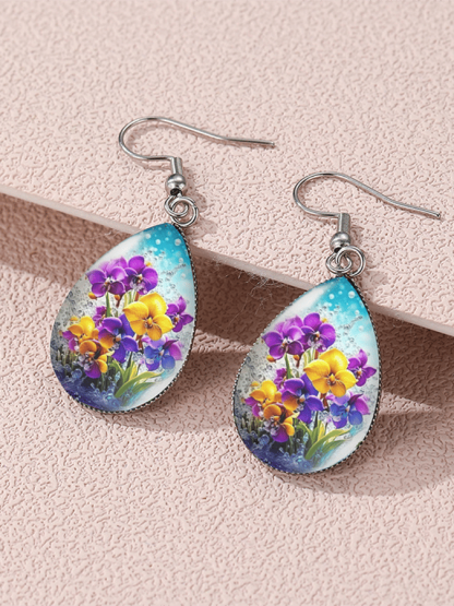 Purple Drop-Shaped Pansy Flower Design Earrings