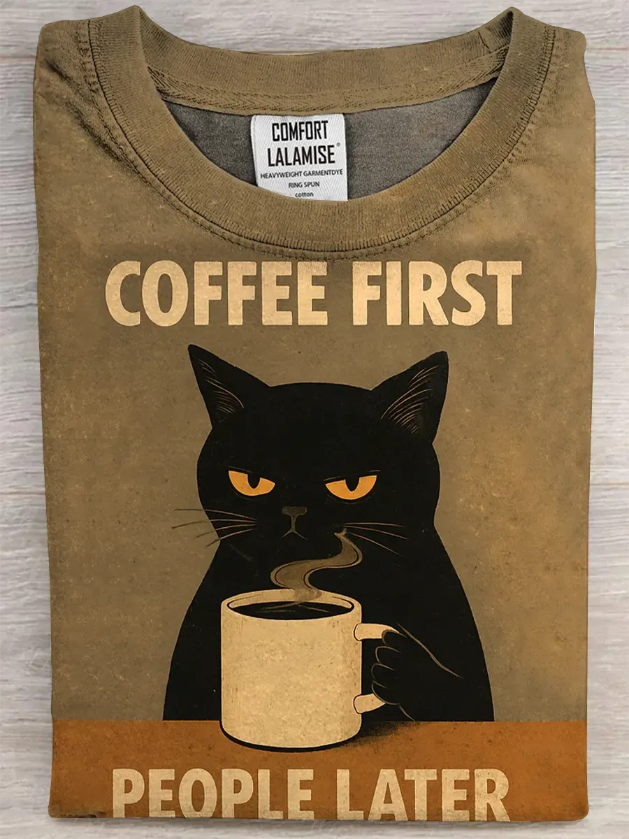 Retro Cat Coffee First People Later Art Fun Print Casual Pure Cotton Short Sleeved T-shirt