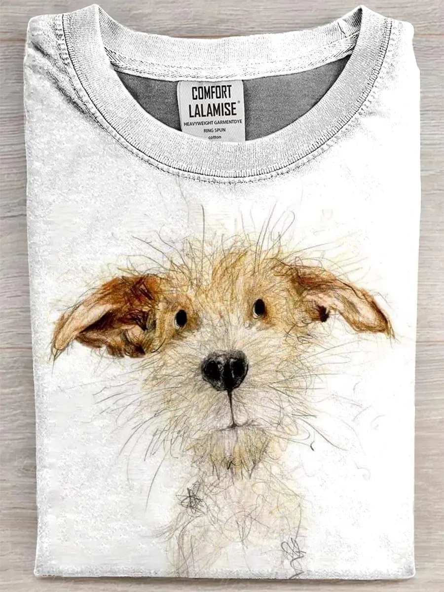 Retro Dog Fun Art Print Casual Pure Cotton Short Sleeved T-shirt