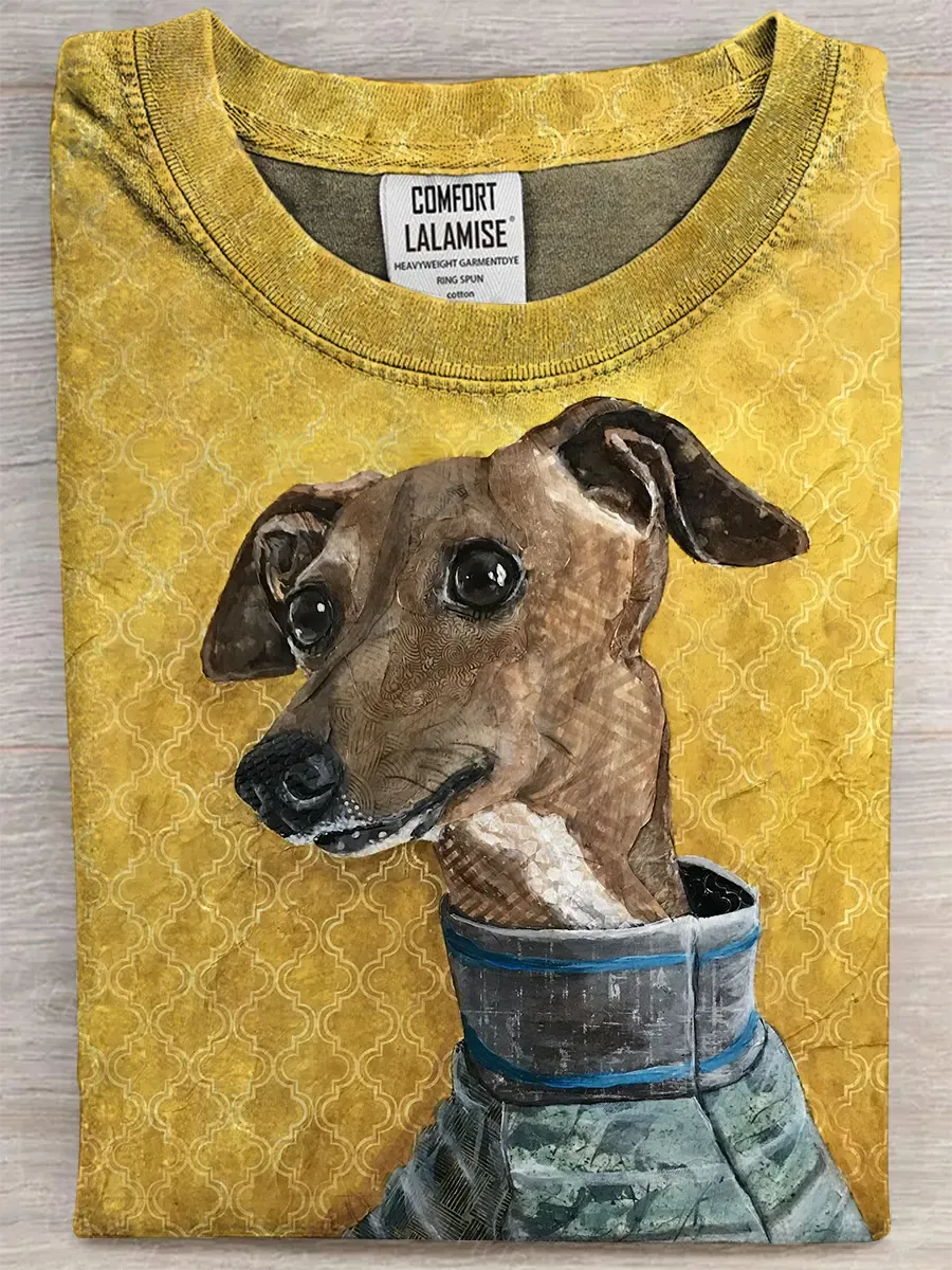 Retro Dog Fun Art Print Casual Pure Cotton Short Sleeved T-shirt