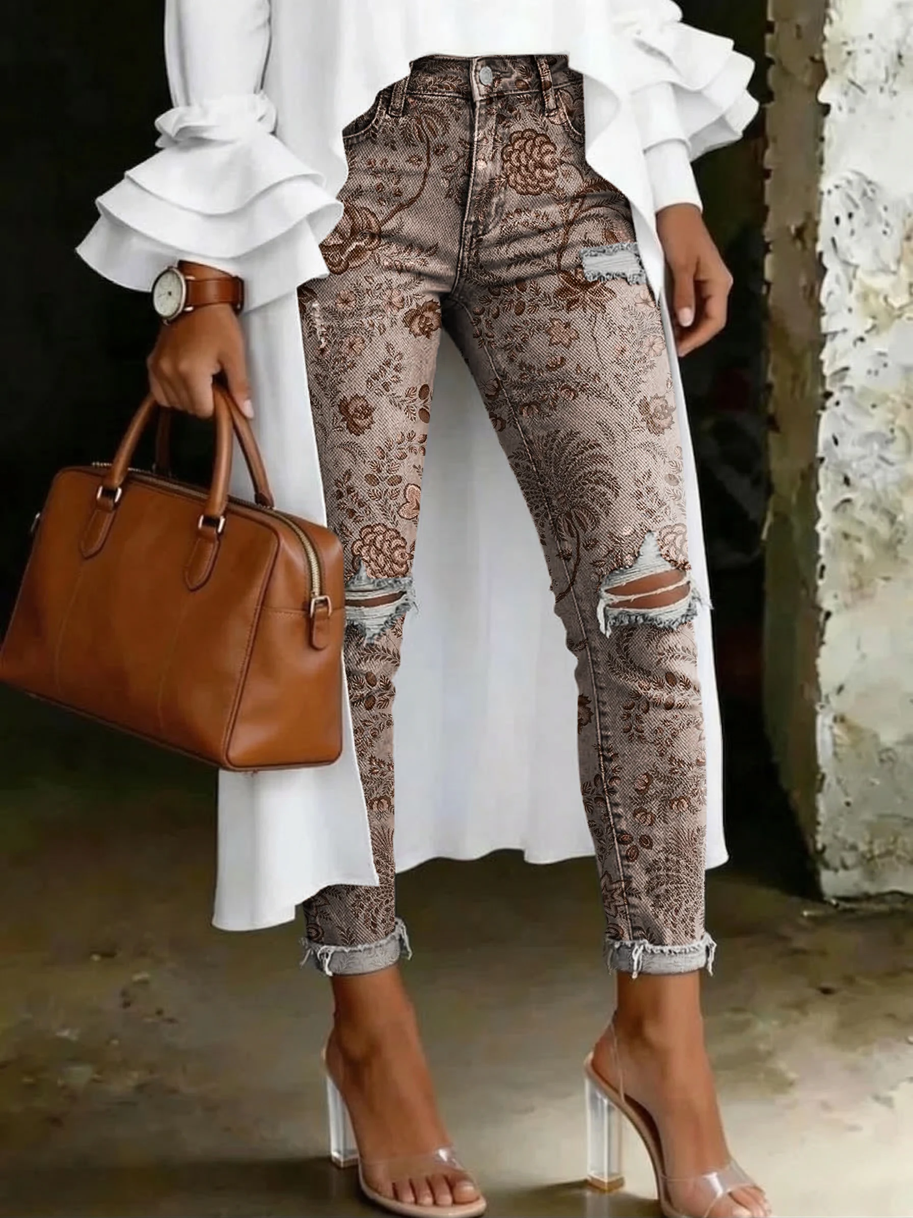 Retro Ethnic Floral Art Print Casual Ripped Skinny Jeans