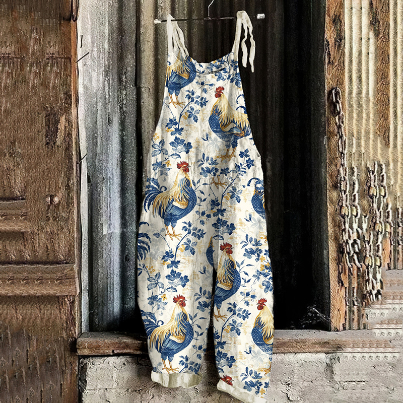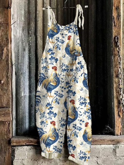 Retro Farm Chicken Leaf Print Sleeveless Jumpsuit